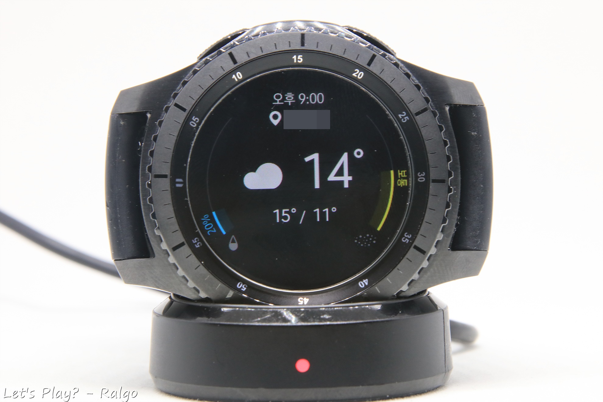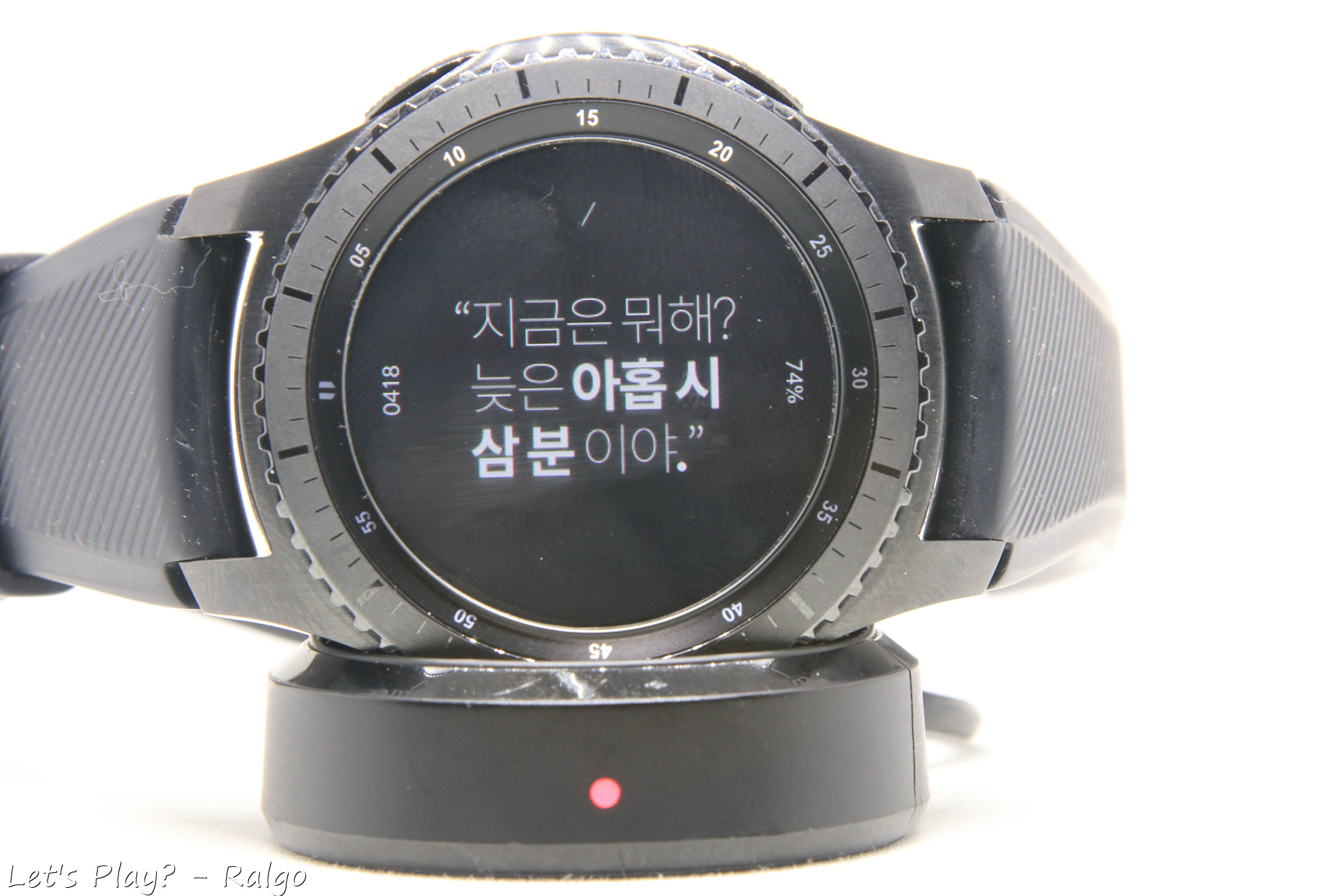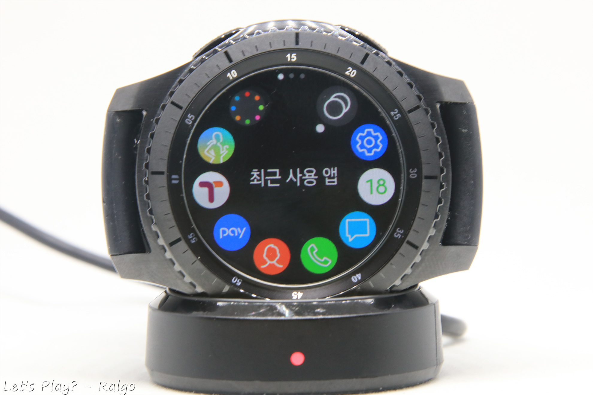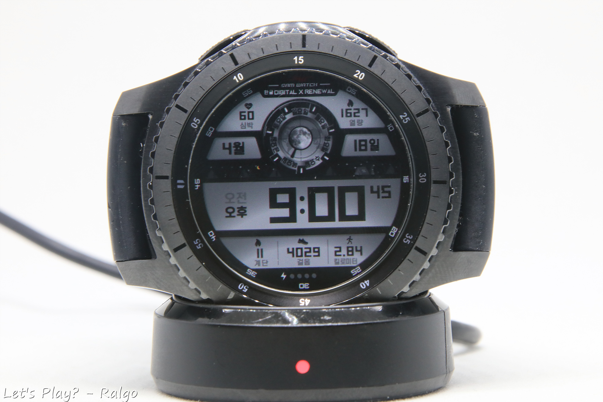충전할 때는 전용 충전독에 거치해서만 사용할 수 있다. 애플워치와는 다르게 서드파티 악세사리들이 많이 없어서 출장 다닐 때 저 거추장스런 충전독을 들고 다녀야한다는 단점이 있다. 애플워치 충전독과 뒷면 코일 크기가 다른지 호환이 안된다. 어찌됬든 시계로써 가독성도 훌륭하다. 시계화면은 AOD(Always on display)를 켜서 항상 시계가 보이게 사용할 수도 있고, 끄고 손목 들어올리기 제스쳐로 시계를 볼 때만 화면이 켜지게 할 수도 있다. 사용하지 않아도 손목을 들어올려 시간을 확인할 수 있는 제스쳐들이 있어서 불편하지 않게 사용할 수 있다. AOD를 켜게되면 설정해둔 시계 화면의 절전모드 비슷한 화면으로 변경되는데, 개인적으론 AOD 화면보다 그냥 꺼진게 더 나은 것 같아서 그냥 해제하고 쓰고 있다. (참고로 사진의 워치페이스는 샘워치 디지털X 리뉴얼이라는 워치페이스로 갤워디 카페에서 무료나눔해주신 워치페이스다)